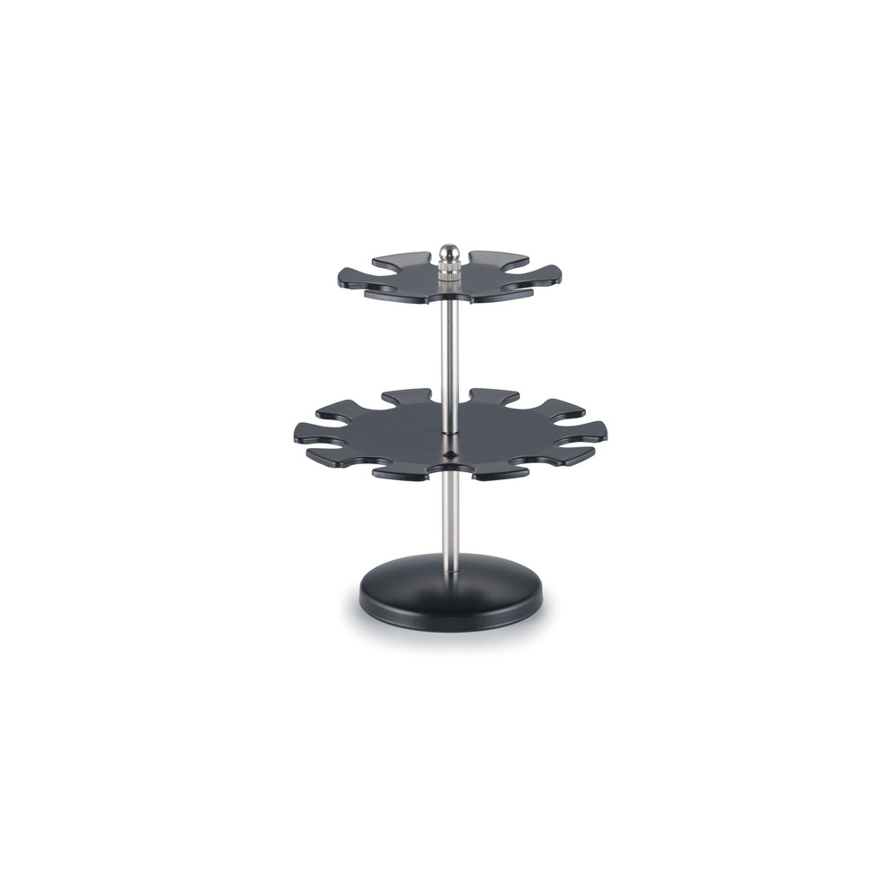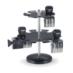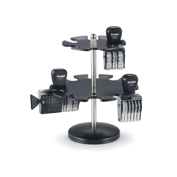 • Stempelträger aus Metall • drehbar • 2 Etagen • stabiler Standfuß • für 16 Stempel • Farbe Schwarz/Silber •